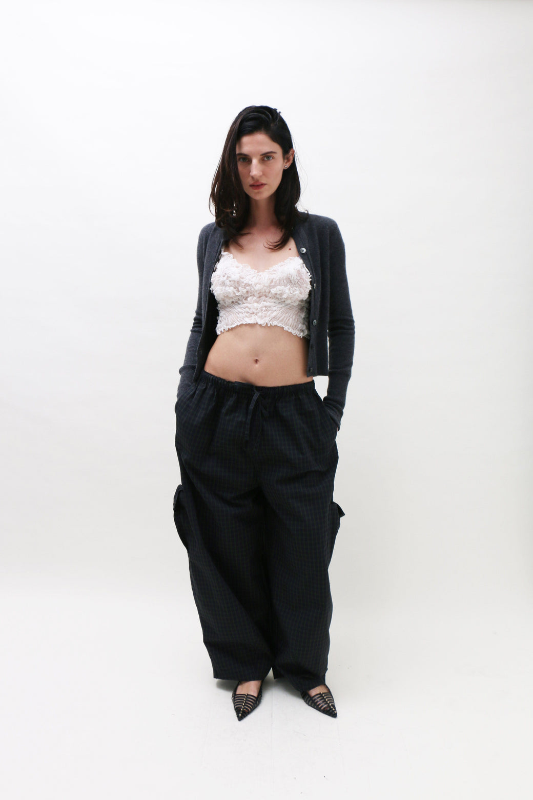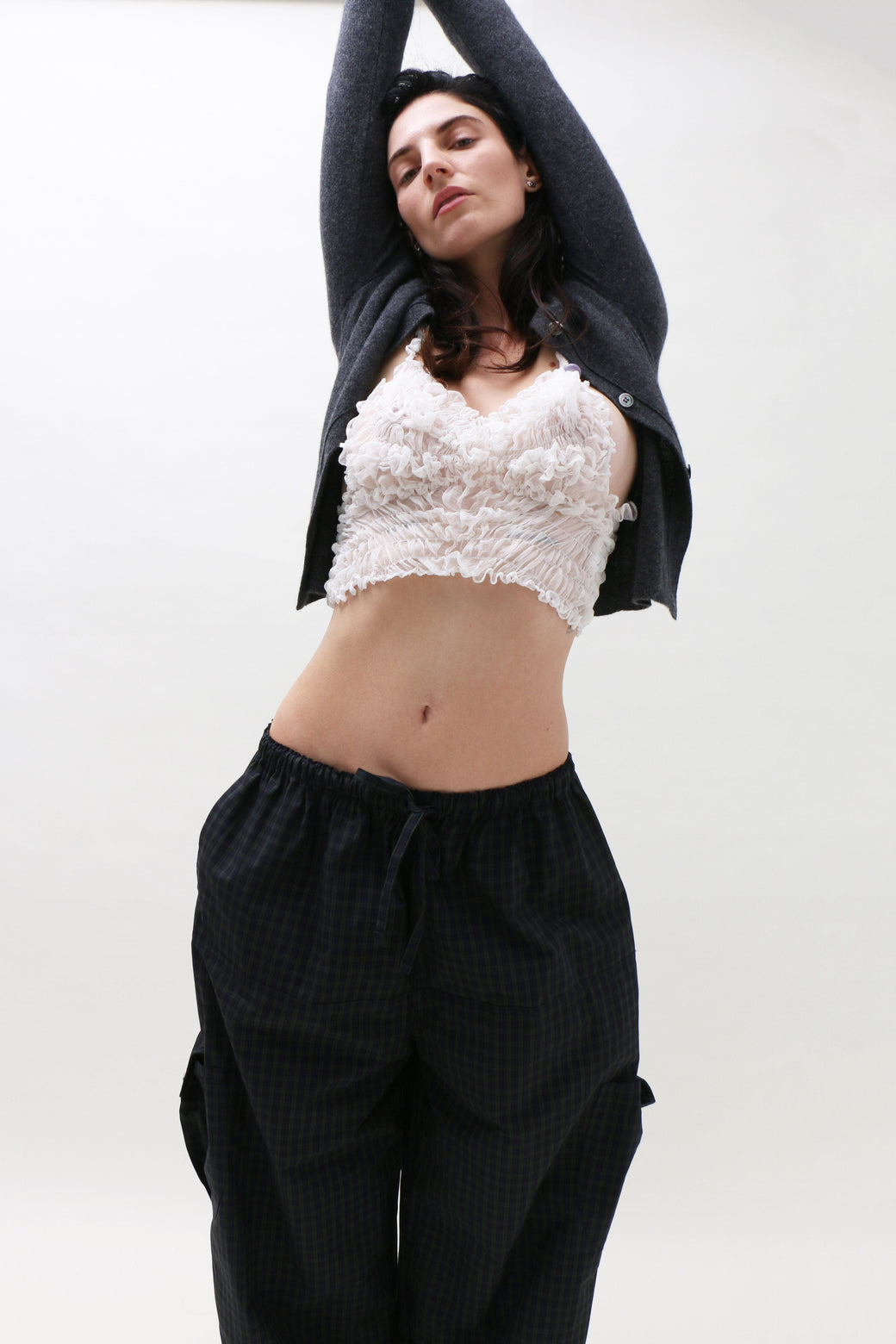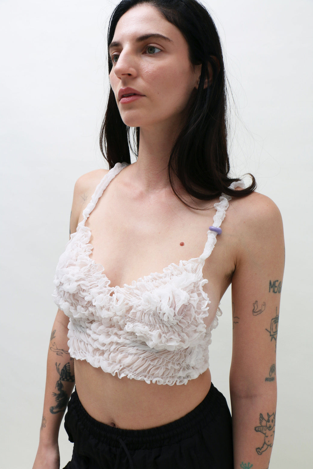 White silk tank cropped top featuring delicate ruching and smocking that contours the body for a flattering fit. Finished with a handmade borosilicate glass bead accent on one spaghetti strap.