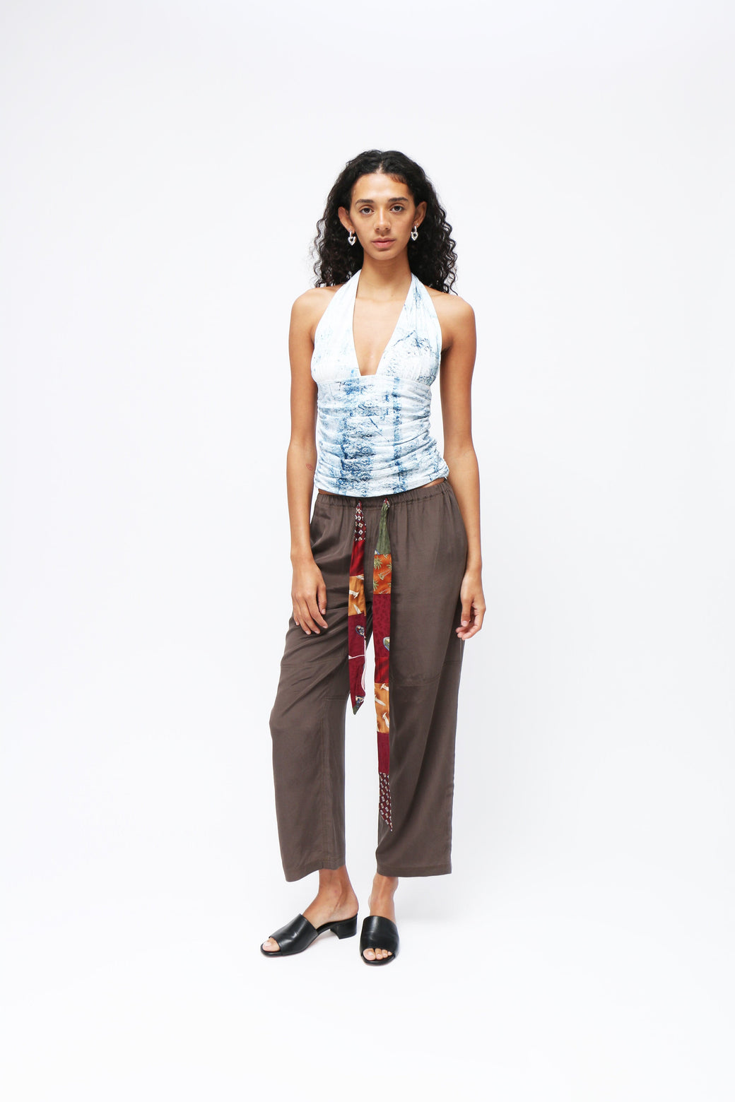 100% silk draw string pant with elasticized waistband. Straight leg. Contrasting multi patterned red self tie at waist.