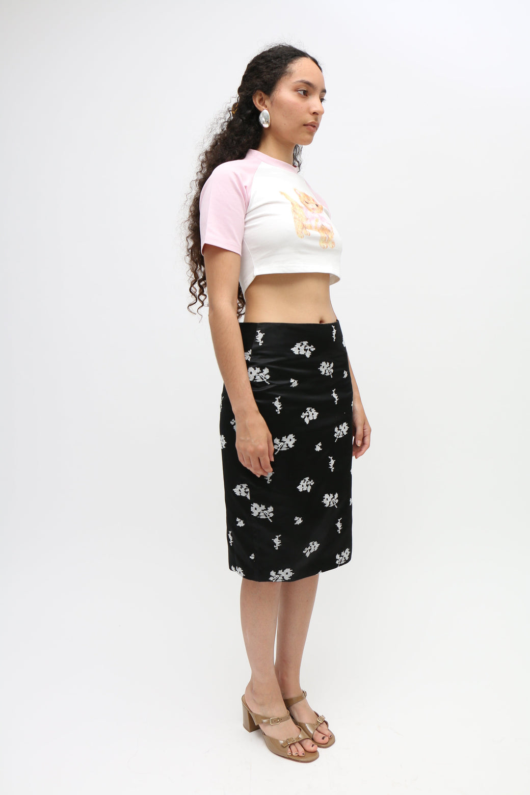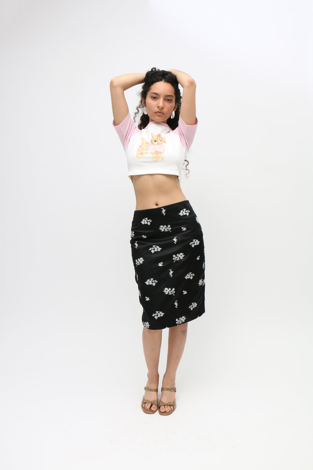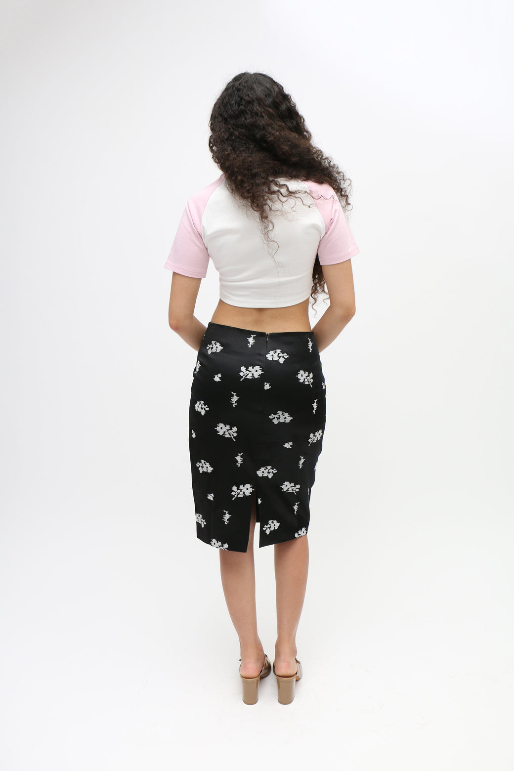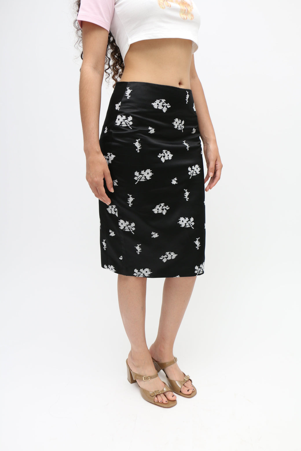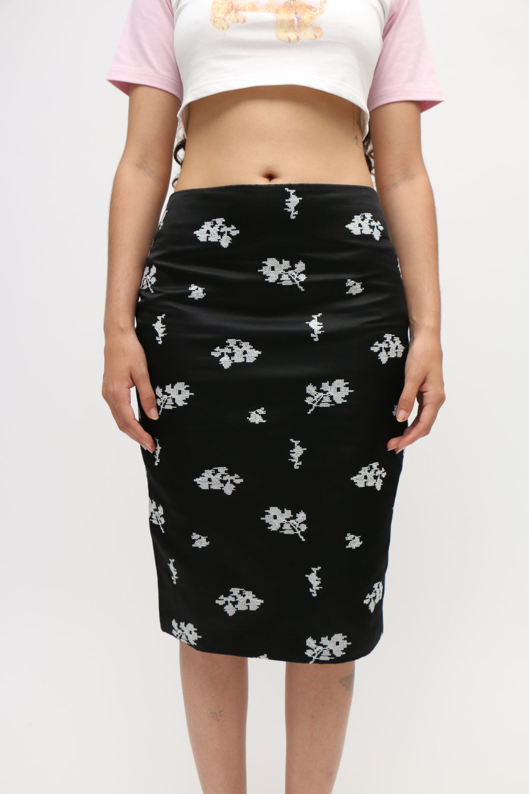 Black silk pencil skirt featuring white embroidered flowers throughout. Midi length with an invisible side zipper and a back slit for added ease of movement.