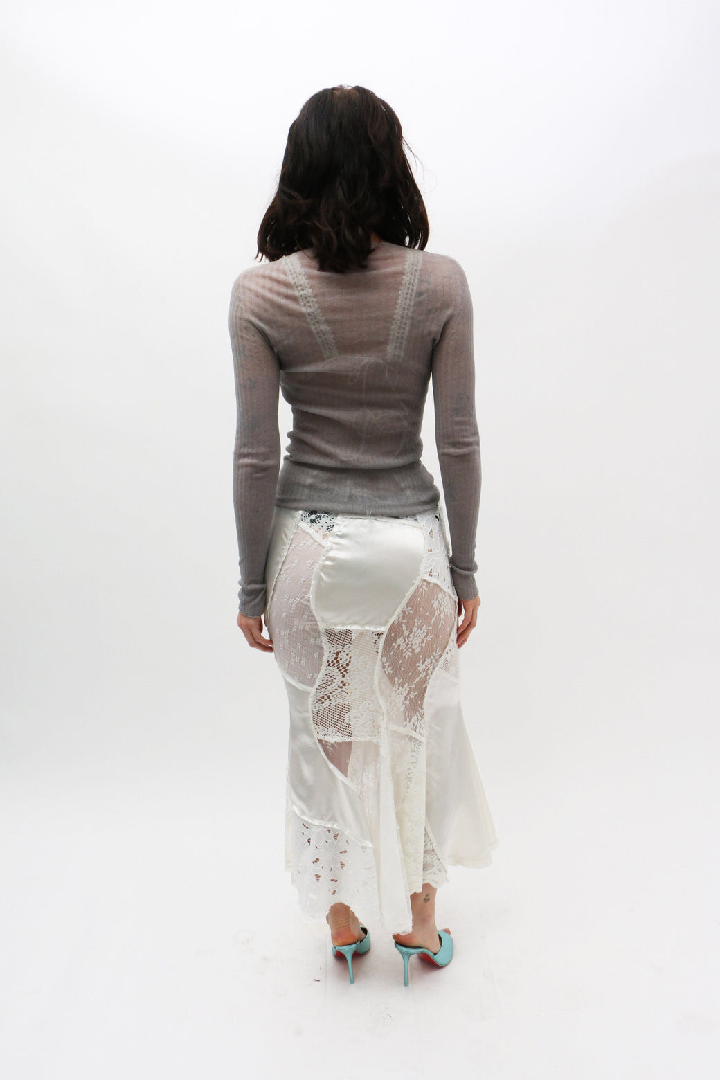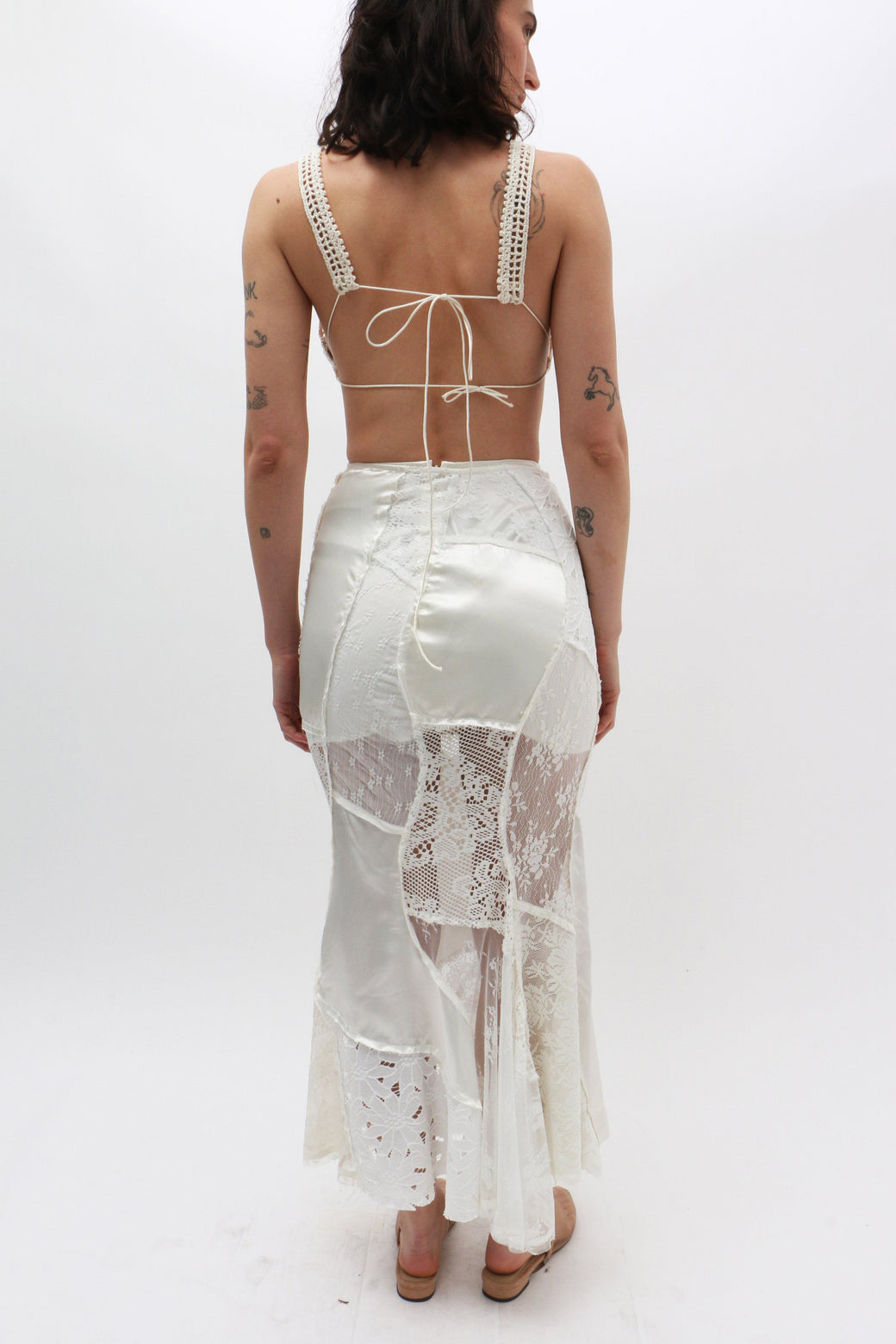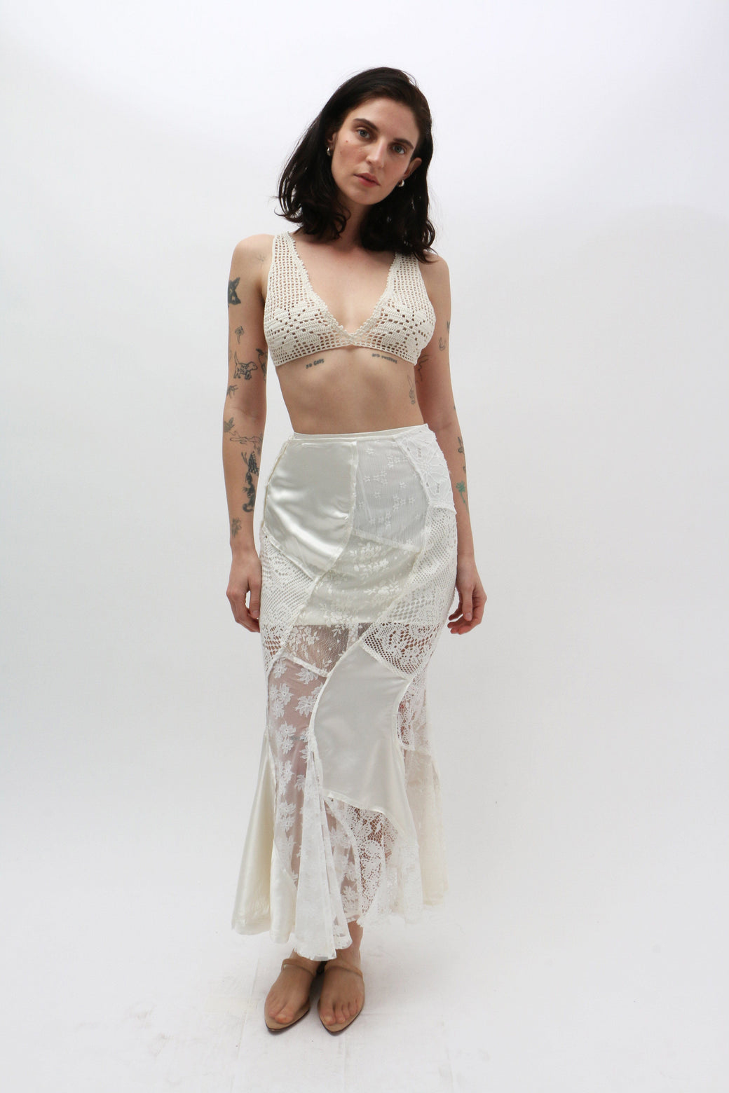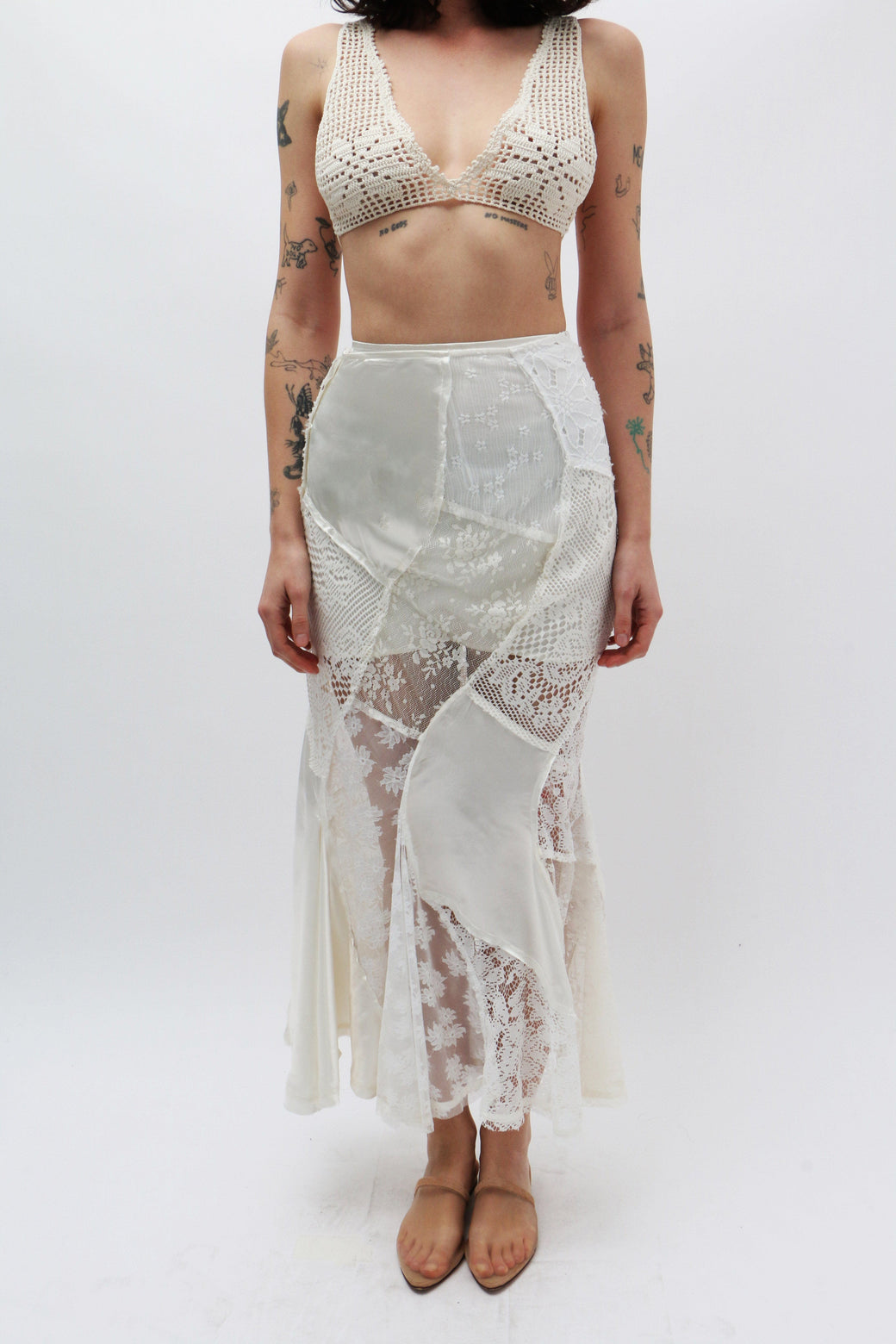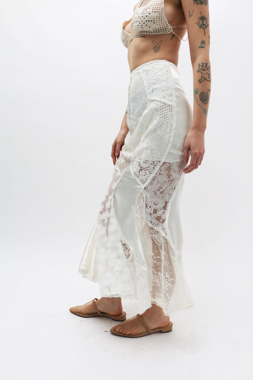 White lace square patchwork mermaid midi skirt with various embroideries and prints. Comes with a removable mini underskirt as seen in video.