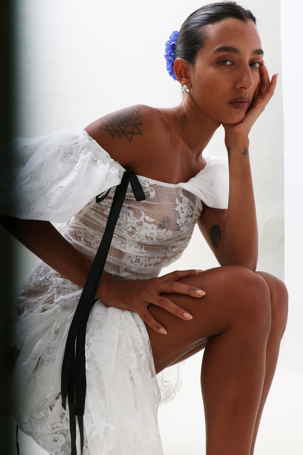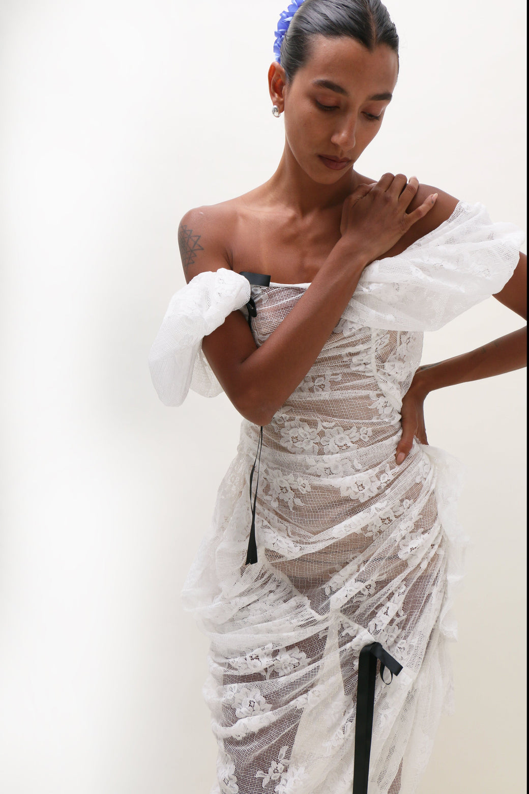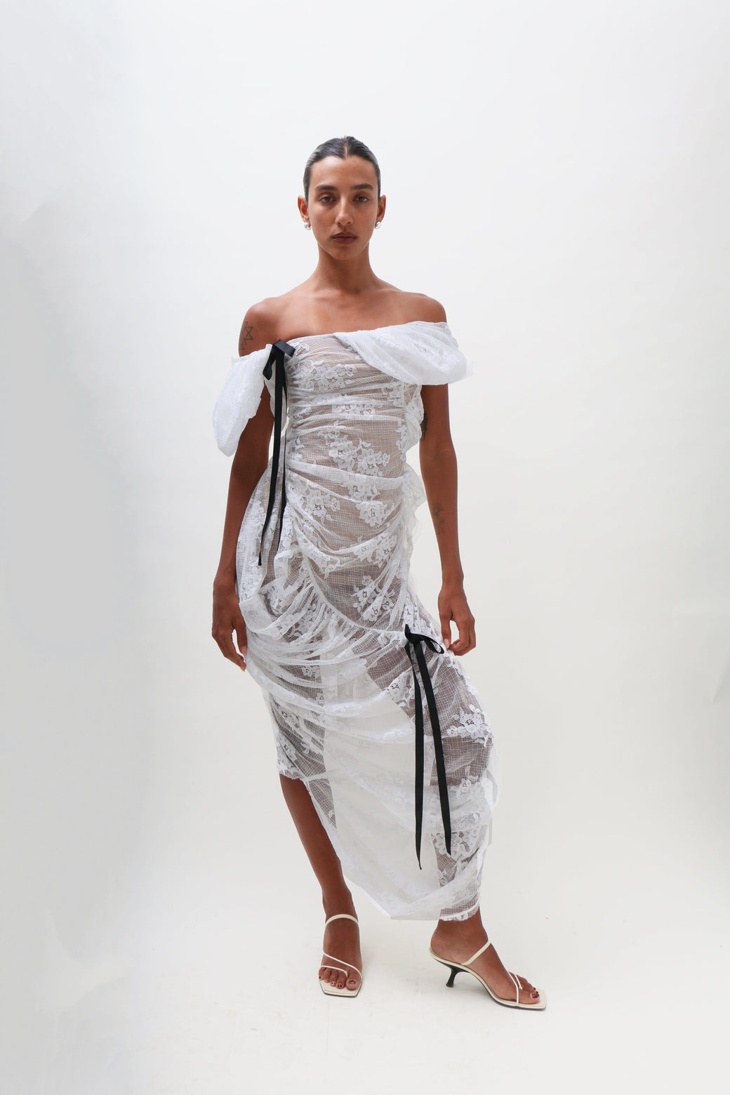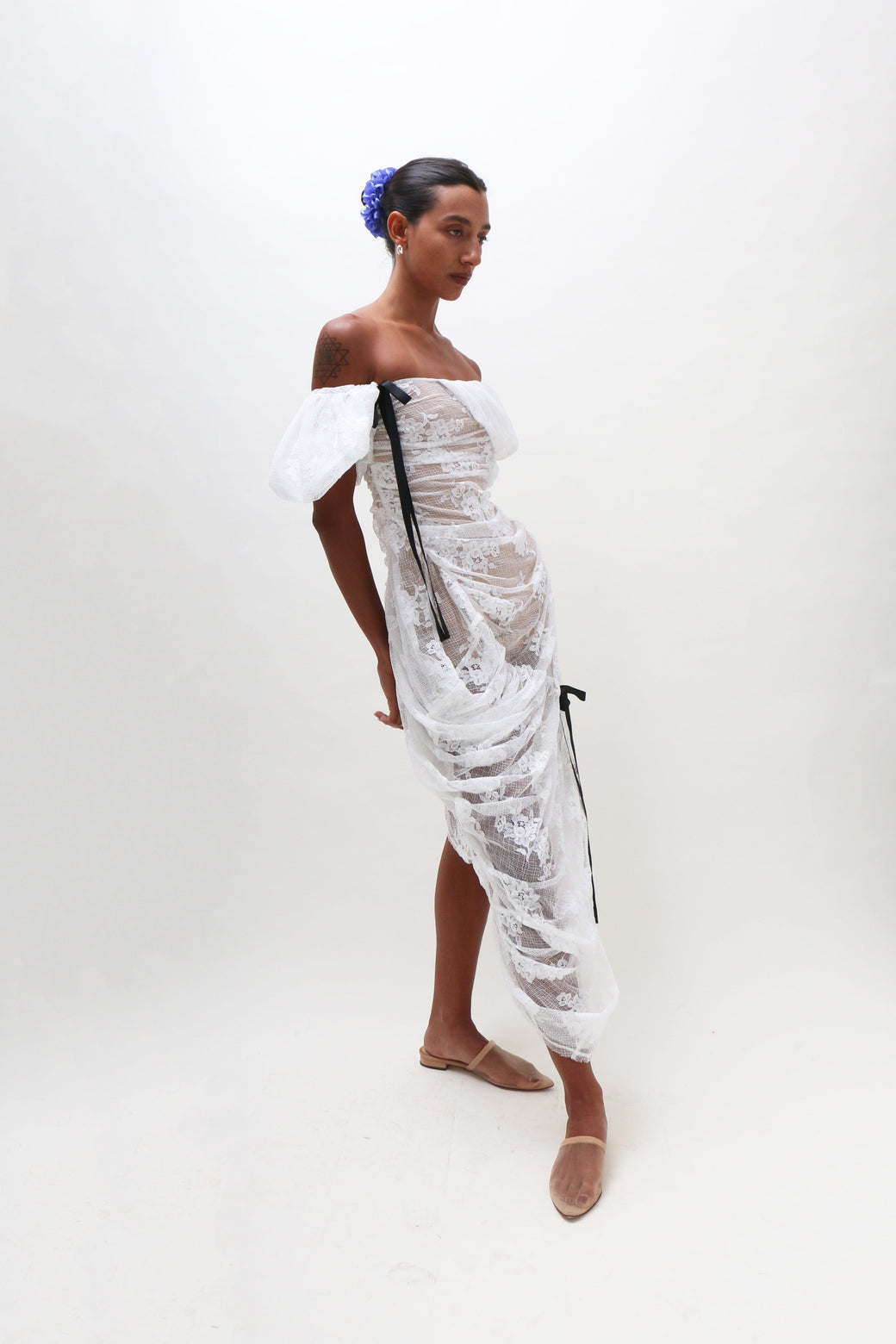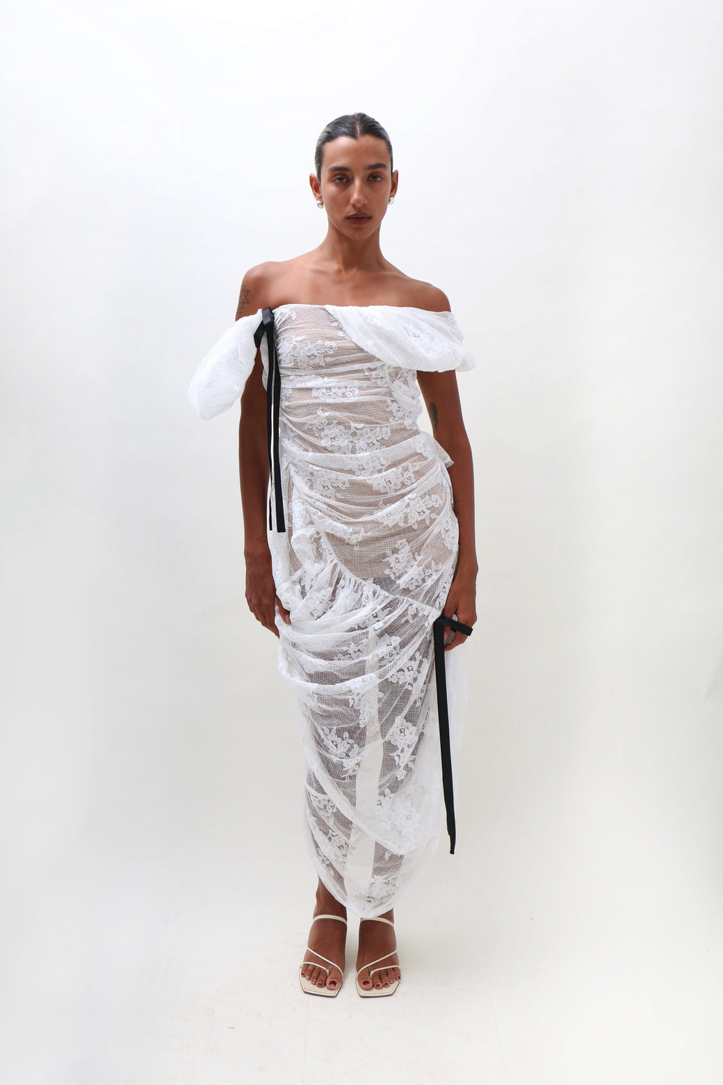 An off-the-shoulder silhouette in draped lace, punctuated by delicate black ribbon ties. Closes with an invisible zipper at the back. Comes with a detachable nude slip — to wear layered or left sheer, as you choose.