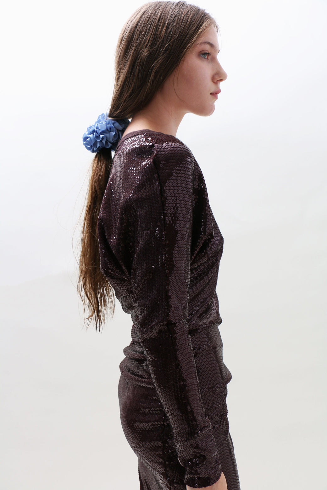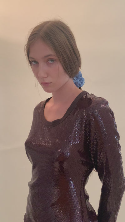 Hair scrunchie in color shiny french blue. Furled silk resembling carnation petals. To be worn in the hair or adorned on the wrist or ankle.
