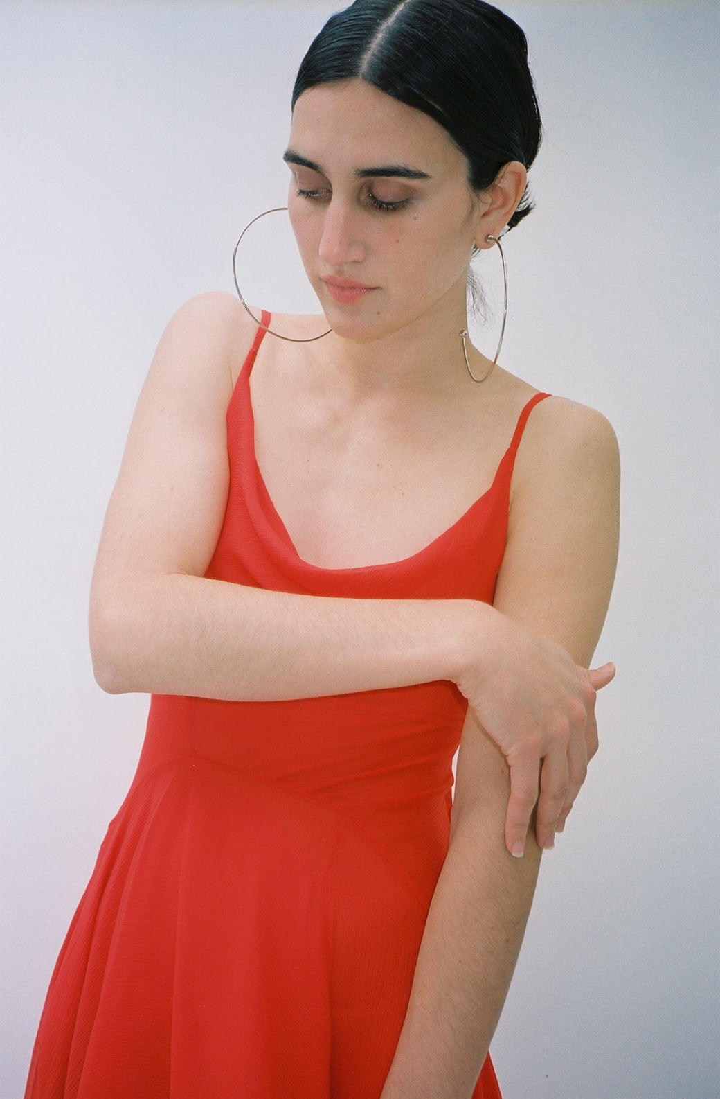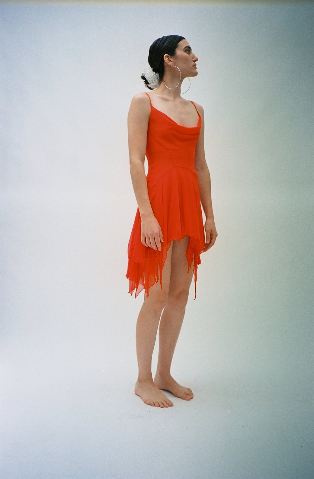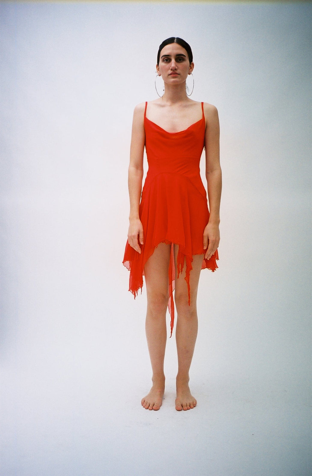 Bias cut dress with asymmetrical handkerchief hem. 100% silk in color bright red. Low neck front cowl drape. Side seam invisible zipper.