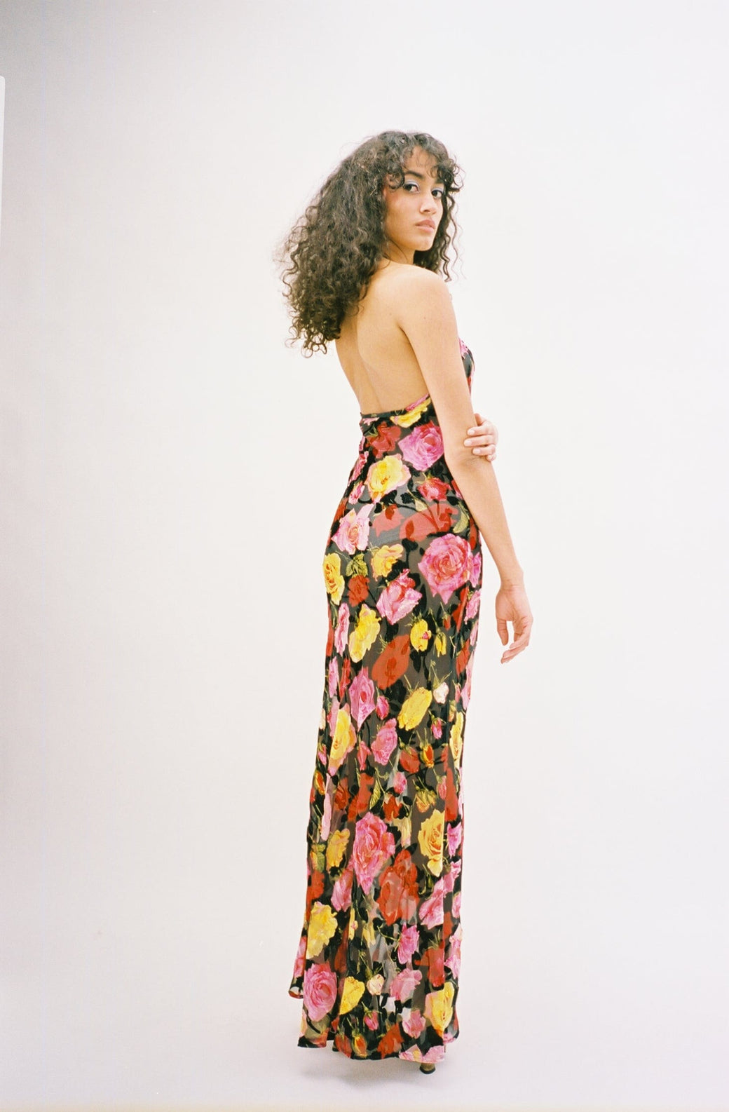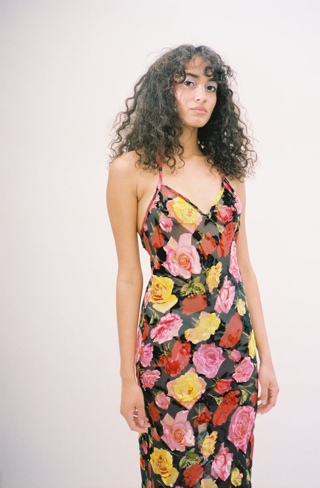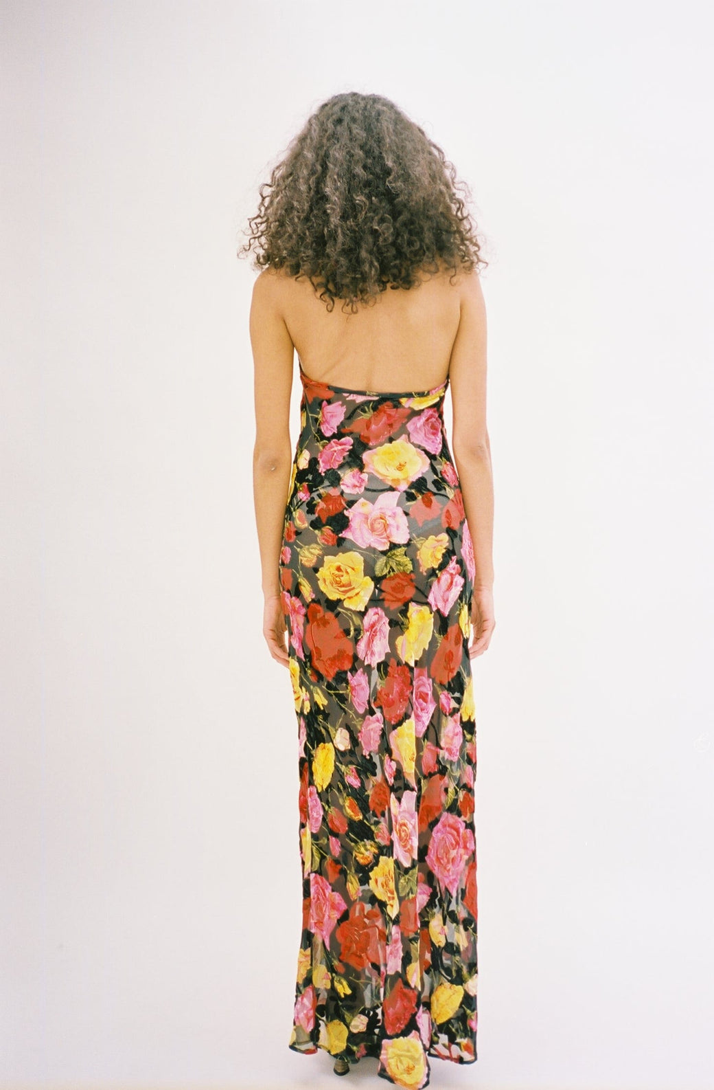 Slip dress cut in a semi-sheer, silk velvet burnout, imported from Italy. The dress features a tie-up halter neck and low scoop back. The demure floral pattern and feminine fit is perfect for any spring occasion.