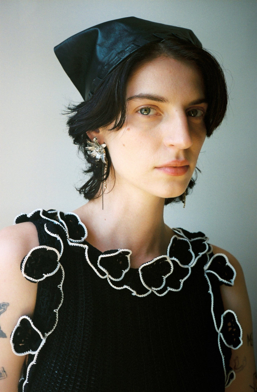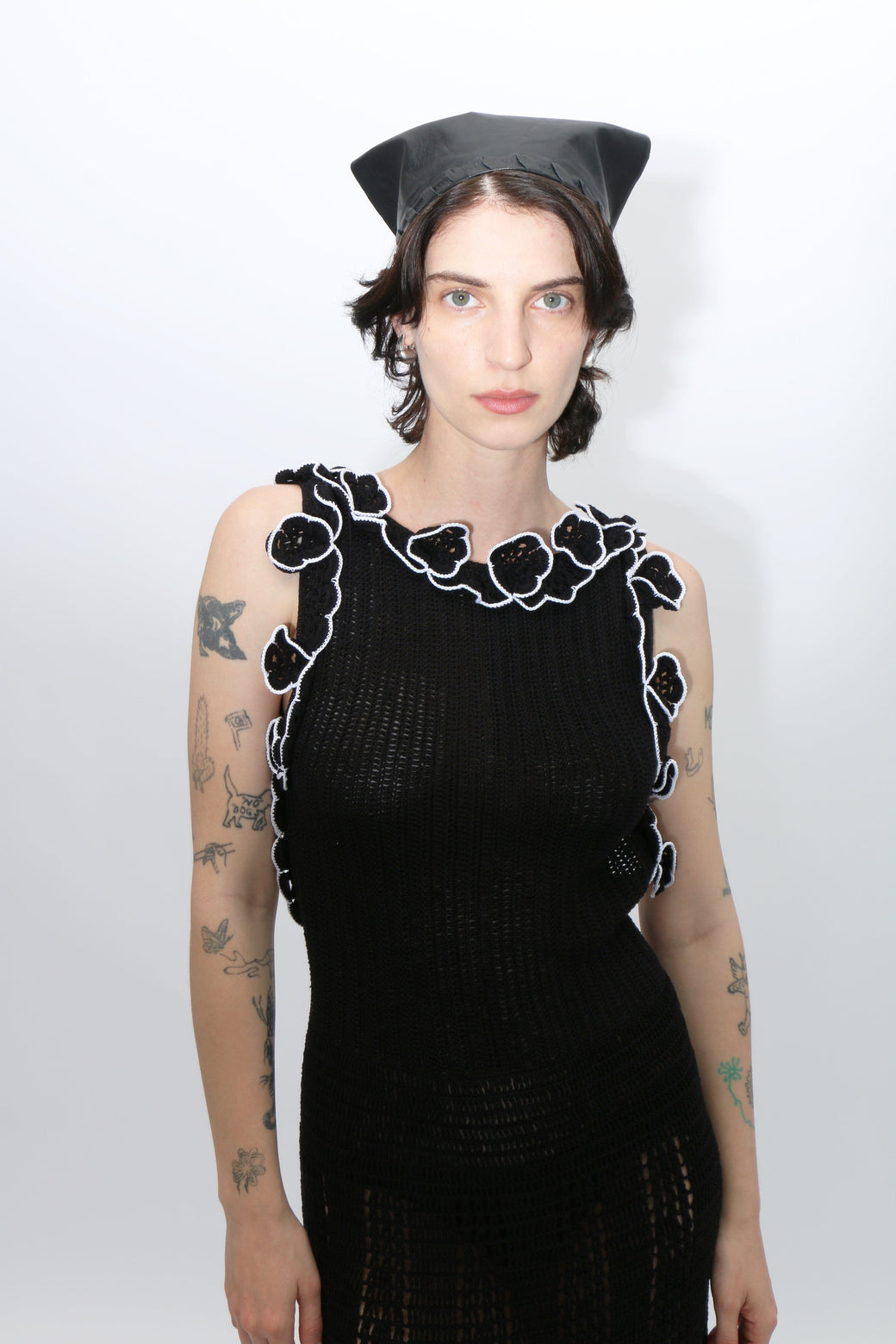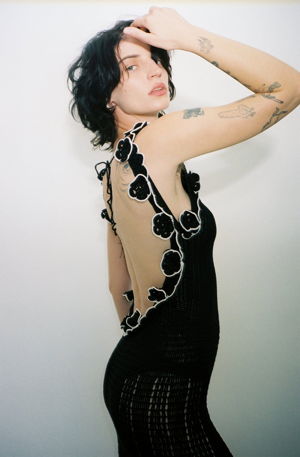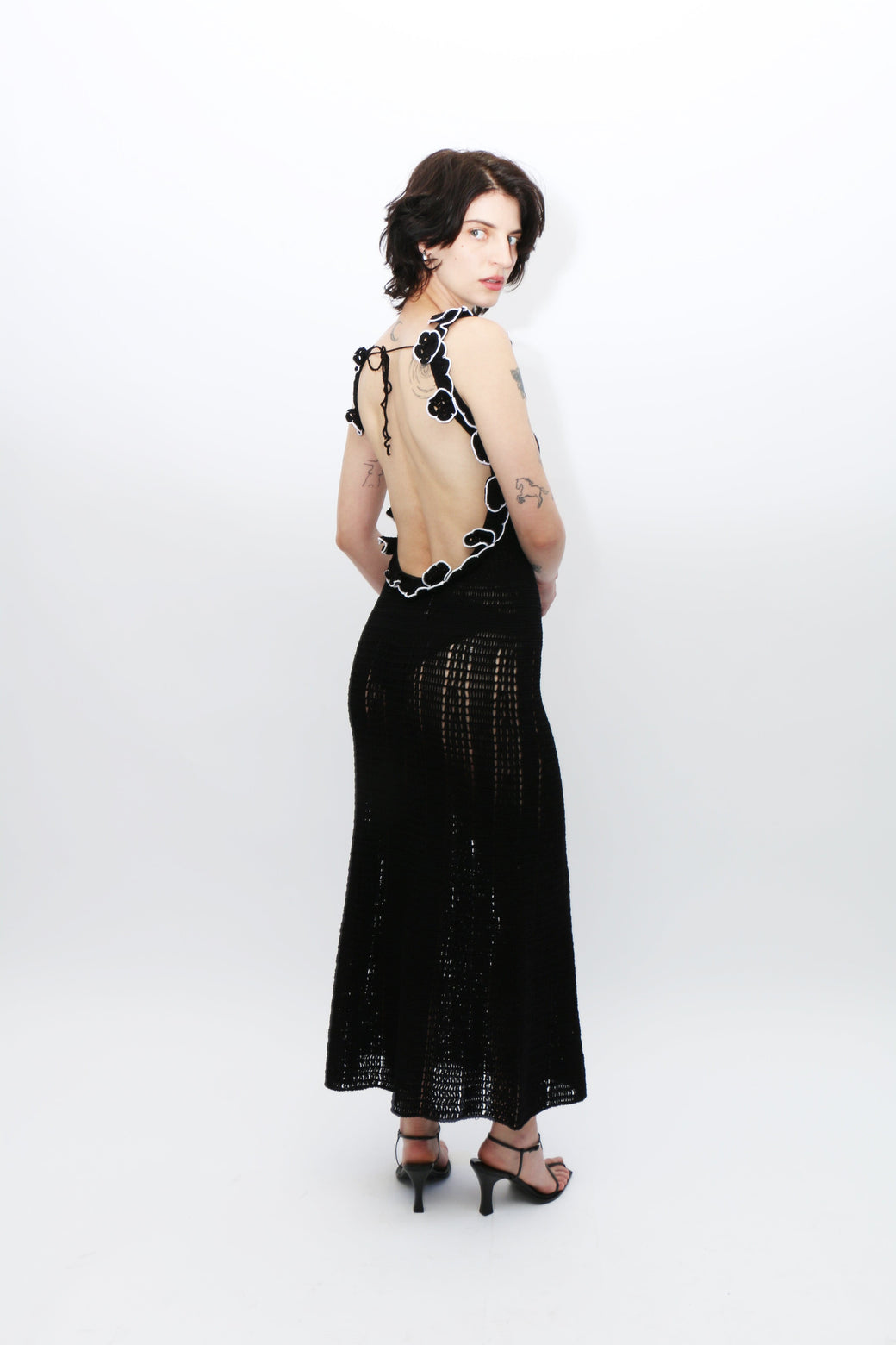 Woven from premium pima cotton, this dress features a plunging open back with simple tie detail. This piece is an open knit which makes it moderately transparent. Beautiful crochet flower details featuring trims of white against the knit black make this the perfect dress for any event.