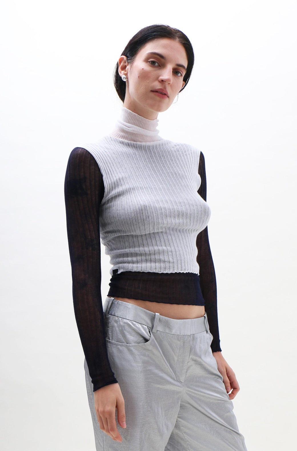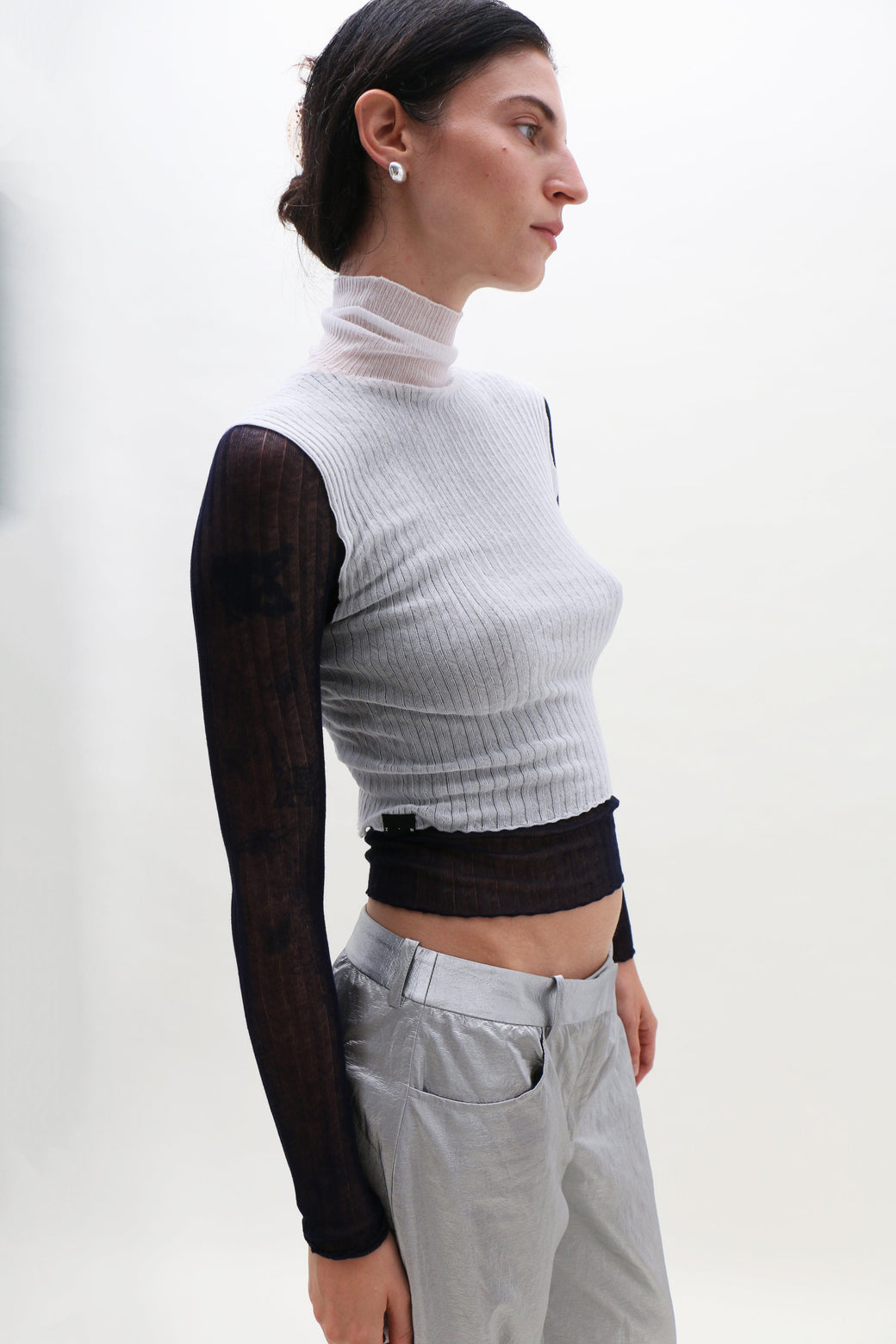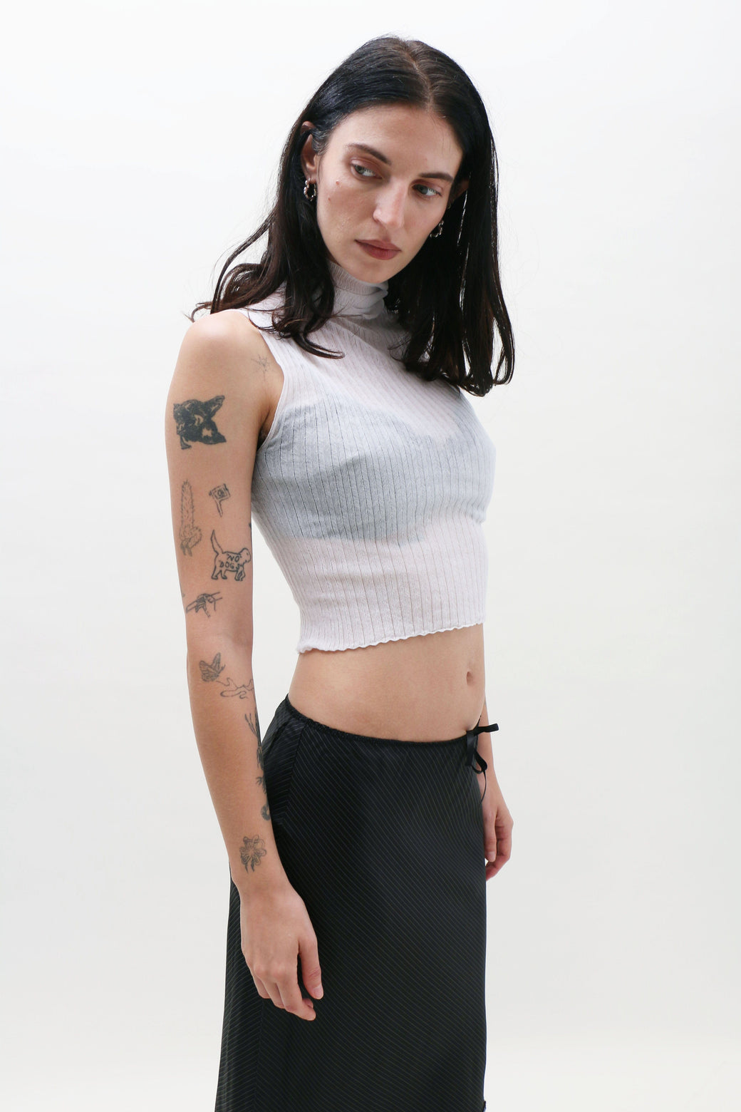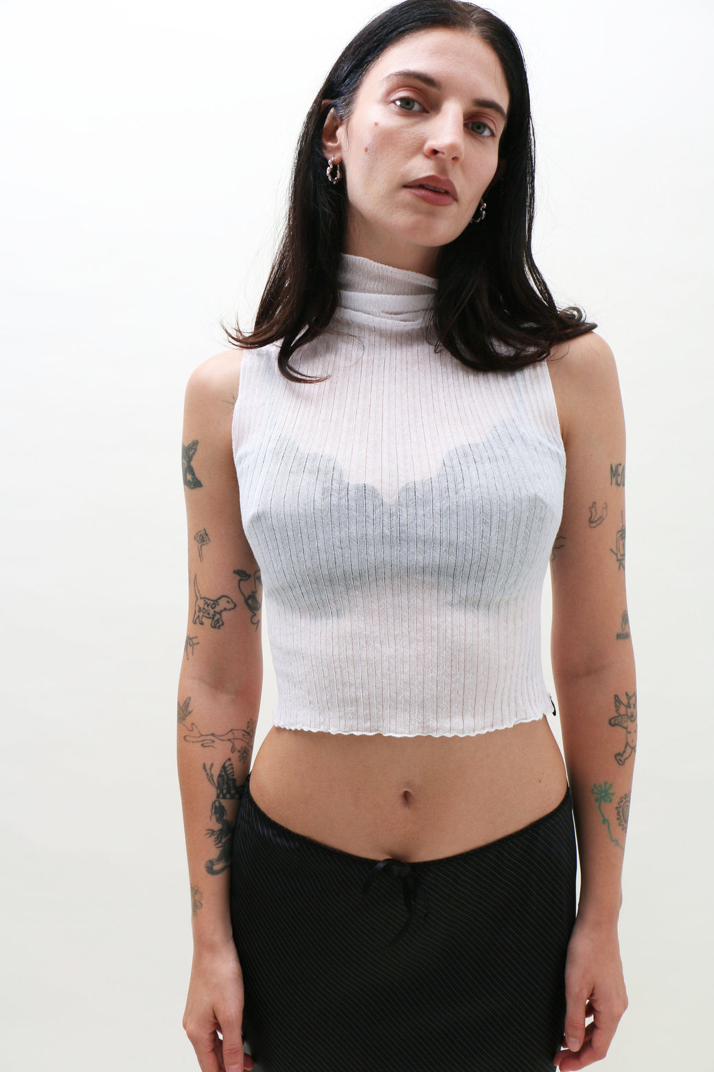 Superfine cotton seamless knit high neck top in white tulle with slightly ruffled edge. Extremely lightweight garment that expands to the contours of your body. These semi-sheer ribbed knits can be worn next to skin or layered under/over garments to add another dimension to your wardrobe. Made in New Zealand.