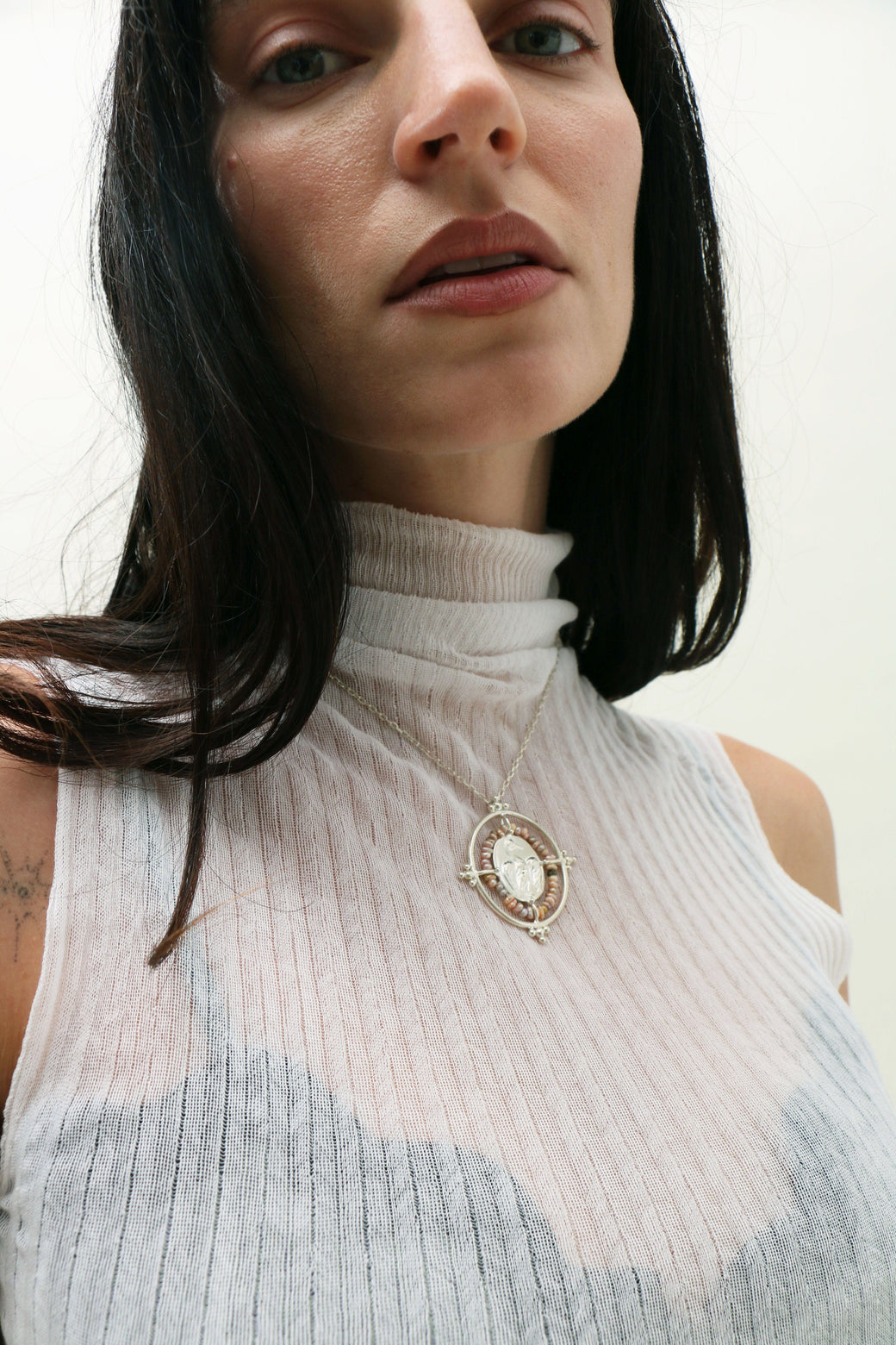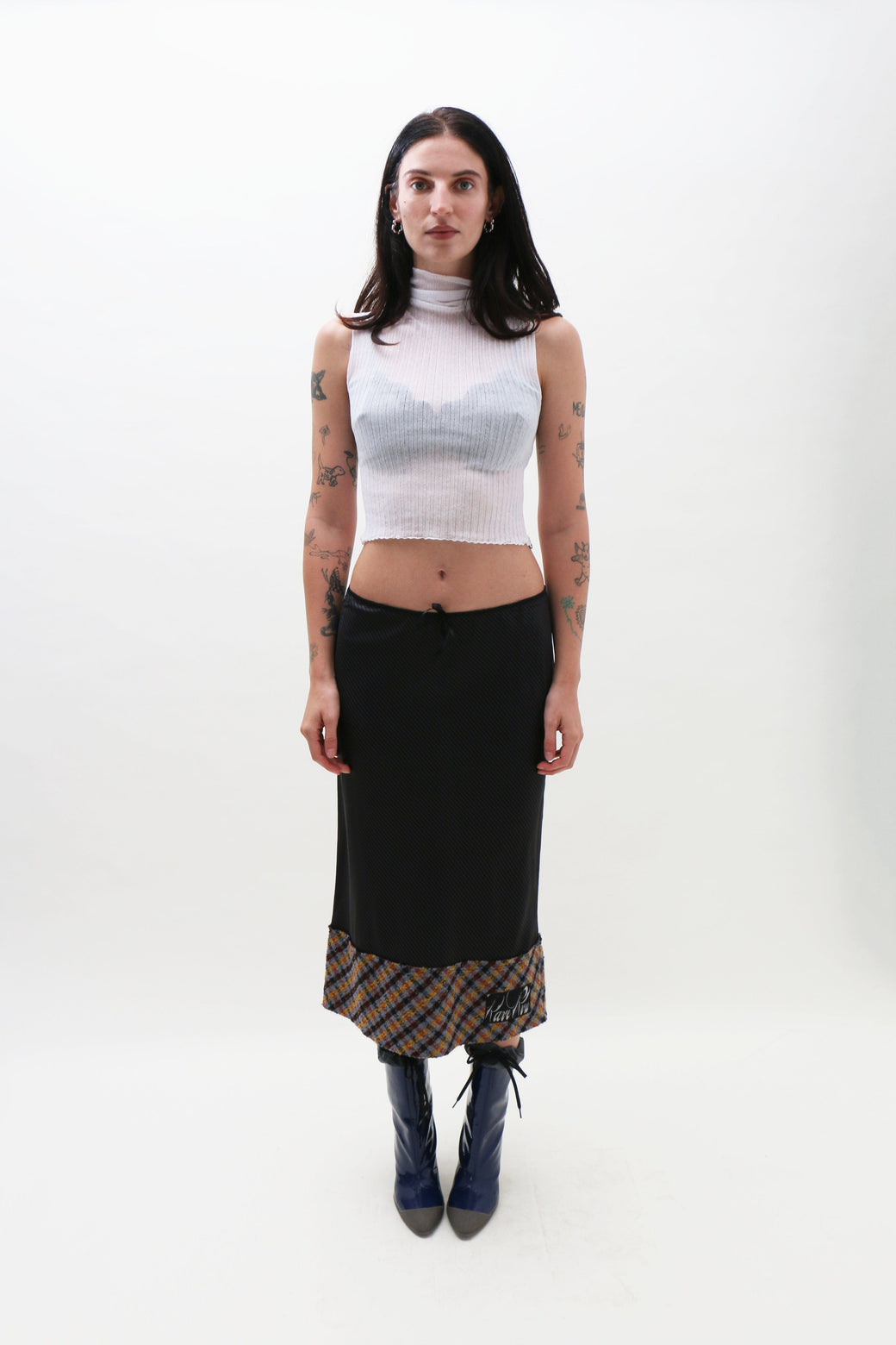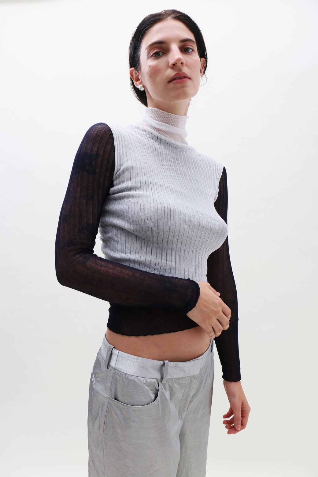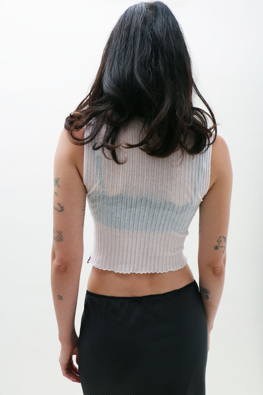 Superfine cotton seamless knit high neck top in white tulle with slightly ruffled edge. Extremely lightweight garment that expands to the contours of your body. These semi-sheer ribbed knits can be worn next to skin or layered under/over garments to add another dimension to your wardrobe. Made in New Zealand.